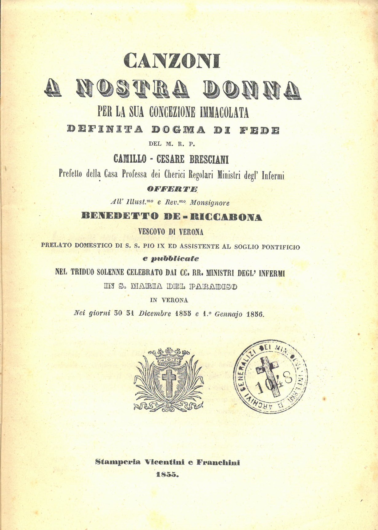 A solo un anno di distanza, nel dicembre del 1855, il padre Camilliano Camillo-Cesare Bresciani, definito il cantore dell’Immacolata che dedicò spesso suoi versi alla Madre Celeste, pubblica le sue prime canzoni in occasione del triduo solenne celebrato dai CC. RR. Ministri degli Infermi in Santa Maria del Paradiso in Verona nei giorni 30 e 31 dicembre 1855 e 1 gennaio 1856.[1]