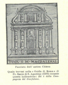 [2] “È la più antica chiesa di Roma dedicata a questa Santa. Il Sacro edificio esisteva già nel 1403 e dava il nome alla vicina contrada che, allora come oggi, diceasi della Maddalena. Alla Chiesa era annesso un ospedale detto dei Battensi”: Prof. Armellini, citato da Amici M., Memorie storiche intorno a S. Camilllo de Lellis, nonché alla Chiesa e casa di S. Maria Maddalena, Tip. Pontificia dell’Istituto Pio IX, Roma 1913, p. 97.