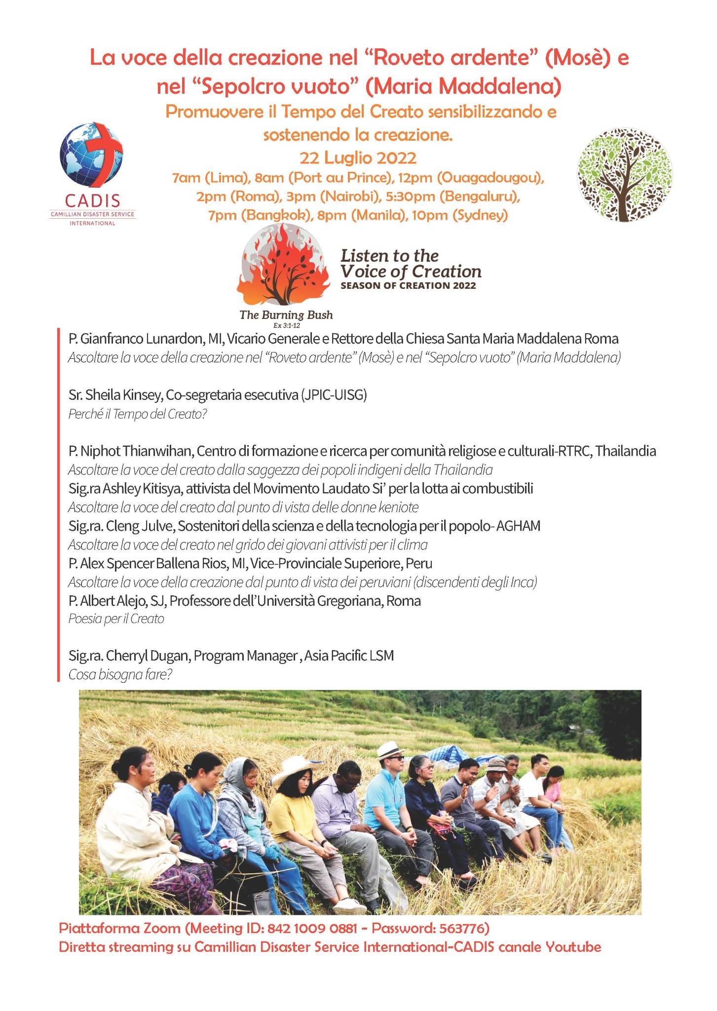 Sempre per il 22 luglio la CADIS (Camillian Disaster Service International) ha organizzato un incontro online per promuovere la Stagione del Creato 2022 che ha come tema “Ascoltare il grido della Terra e la Buona Novella di Maria Maddalena”.
