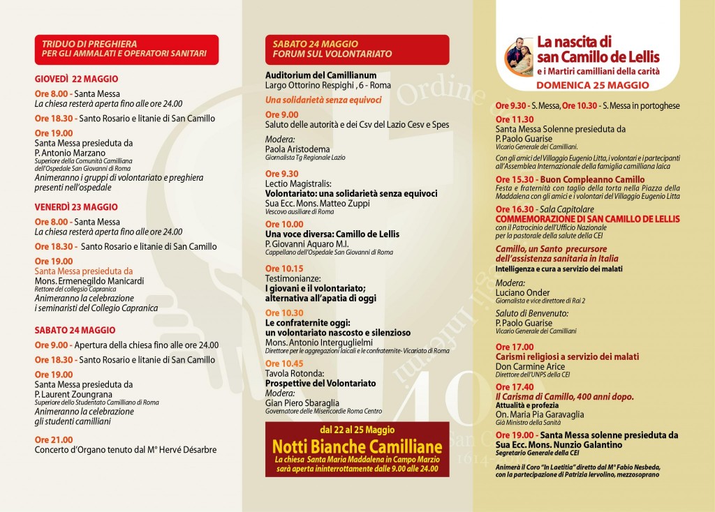 I festeggiamenti di quest’anno assumono una solennità particolare alla luce del quarto centenario della morte di San Camillo. La data del 25 maggio sarà celebrata a Roma con un convegno patrocinato dall’Ufficio nazionale per la pastorale della salute della Conferenza Episcopale Italiana, che culminerà in una santa Messa presieduta dal Segretario generale della CEI, monsignor Nunzio Galantino.