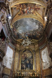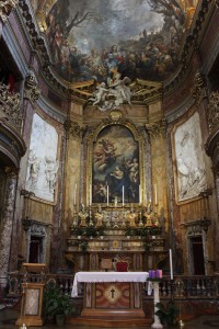 La Cappella dell’Altare Maggiore, compresa tra due cappelle laterali, rappresenta il fulcro della chiesa, verso cui convergono prospetticamente le linee di costruzione di tutti gli elementi orizzontali e verticali della navata e della crociera, compreso lo sguardo dello spettatore.