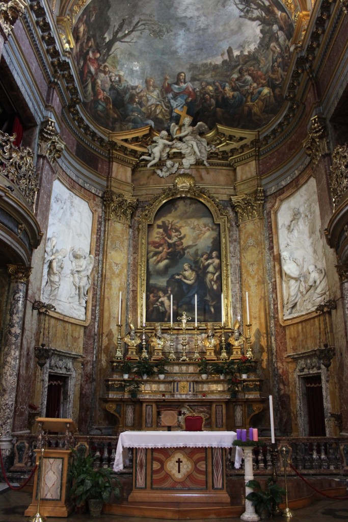 All’andamento audace e concavo delle pareti laterali dell’abside e della cornice in alto, fa da contrappunto la linea leggermente convessa della parete frontale, inquadrata da due semipilastri con capitelli dorati, che ha anche lo scopo di migliorare il ritorno acustico del suono dell’organo. La parete frontale accoglie il dipinto con Santa Maria Maddalena in preghiera e la Croce camilliana portata in Gloria dagli angeli. La santa, inginocchiata in primo piano, guarda con estatica partecipazione la croce, assieme a figure di angeli, mentre sullo sfondo un gruppo di putti alati dilata lo spazio in profondità. L’opera, che fu realizzata dal parmense Michele Rocca nel 1698, rappresenta un’importante prova giovanile dell’autore che si trovava ad operare a Roma nella cerchia di Sebastiano Conca. Il dipinto, che era originariamente di forma rettangolare prima che gli venisse aggiunta la centina, forse nel periodo in cui fu decorato a fresco lo spazio sovrastante, venne sistemato in loco nello stesso anno, quando Felice Fardichini ne intagliò la ricca cornice dorata, conclusa in alto da una motivi floreali, colombe e una raffinata conchiglia.