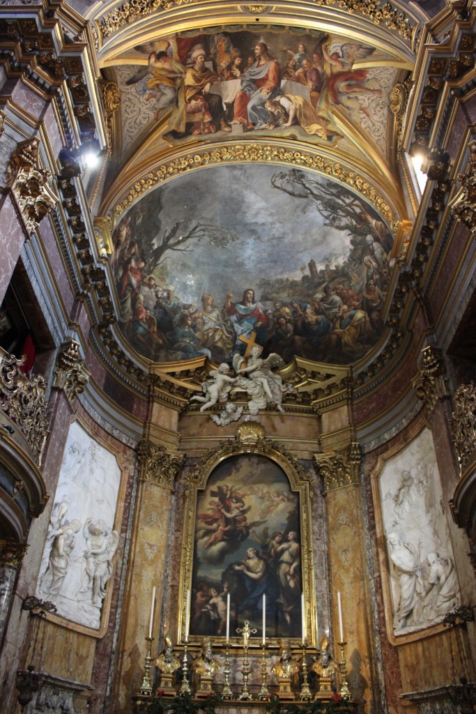 Alcune fonti ritengono che l’affresco sia stato realizzato durante i lavori di decorazione della volta eseguiti da Michelangelo Cerruti nel 1732. Tra l’abside e la cupola si trova un altro affresco del Cerruti raffigurante La cena in casa del Fariseo. Nella Cappella dell’Altare Maggiore si notano anche due coretti laterali, sopra i due passaggi in legno, con raffinati e minuziosi intagli.