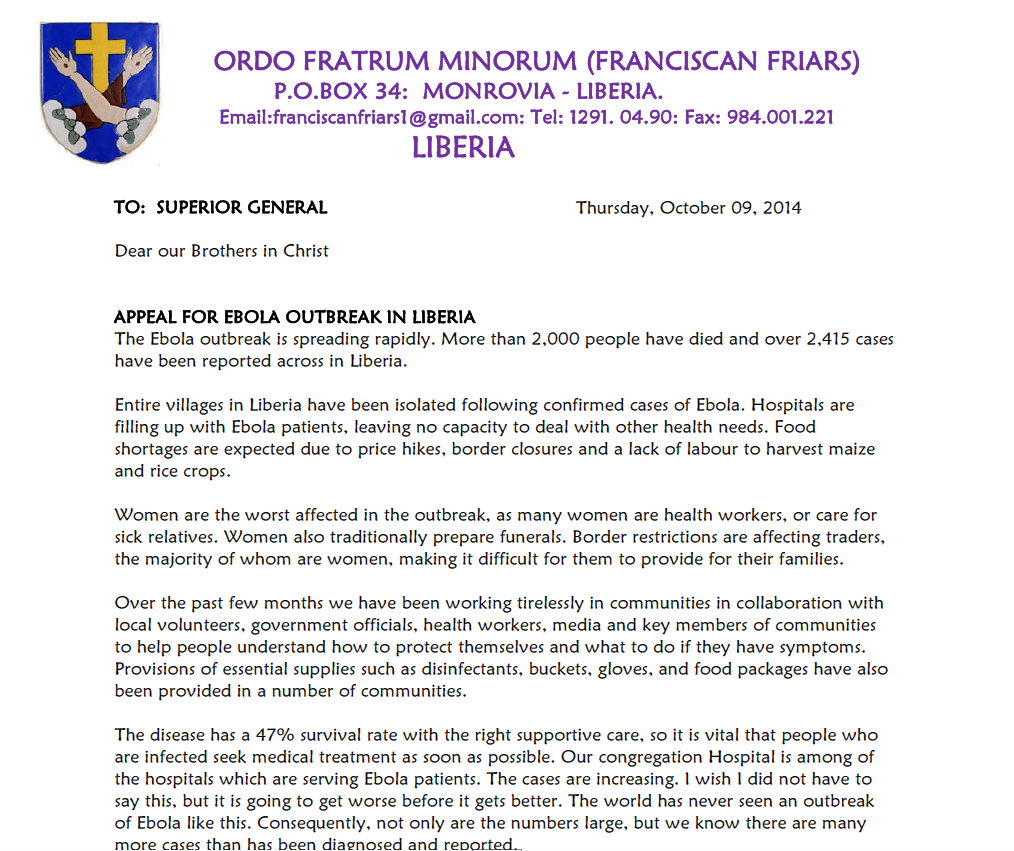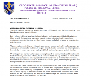 Appello per l’emergenza ebola in Liberia del Ministro Provicniale dei Francescani Minori di Monrovia – Liberia
