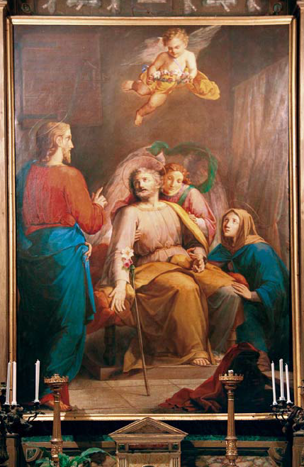 La pubblicazione inizia con notizie del Quadro donato dalla Nobil Donna Romana alla morte di San Camillo (1614), e dei primi 200 anni di grande devozione del Popolo Romano che elesse la Parrocchia di S. Maria Maddalena come Santuario. Ma di questo abbiamo ampia documentazione e quindi lasciamo. Quanto invece ci colpisce e sorprende è l’associare il nostro S. Camillo a S. Giuseppe con la definizione di «principali protettori, come ognun conosce, della morte….»