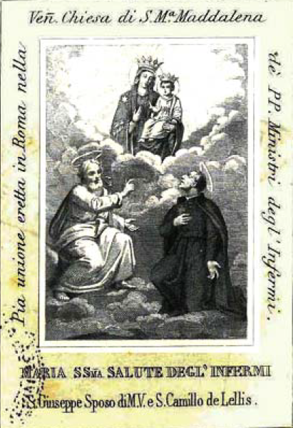 Dalle polveri dell’Archivio emerge una pubblicazione del 1869 dedicata alla «Arciconfraternita di Maria SSma Madre della Salute» così presentata: «L’idea qual fu concepita si esegui: e la Pia Unione sotto l’invocazione di Maria SSma Madre della Salute, e dei SS. Giuseppe di Lei Sposo, e Camillo De Lellis, veniva eretta in Roma nella Chiesa di S. Maria Maddalena dei PP, Ministri degl’Infermi nel di 15 Giugno 1860 con approvazione e Rescritto dell’Emo Card. Costantino Patrizi Vicario Generale della Santità di Pio Papa IX. Quanto questa fosse di gradimento ai fedeli, e giovevole, allo scopo, a cui si dirigeva bene addimostrar si potrebbe colla gara suscitatasi tra i devoti nel celebrare con una pompa veramente solonne il seconda Centenario della Inconorazione della Imagine in discorso, fatta già dall’insigne Vaticano Capitalo nell’anno 1668…. (omissis) gli omaggi della loro divozione; quali per verità si appalesarono maggiori per numero, e più belli per la intensità dello affetto.»