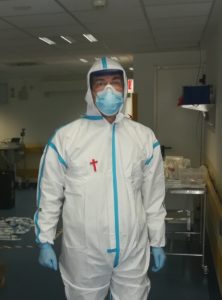 Per impartire le molte Unzione degli Infermi ai malati Covid nelle 5 Rianimazioni evitando di consumare troppi dispositivi di protezione individuali (Dpi), in quanto avrei dovuto vestirmi e svestirmi entrando ed uscendo in ognuna delle rianimazioni, ho adottato questo sistema: rimanendo nella parte “pulita” del reparto passavo un cottonfioc imbevuto di Olio Santo all’infermiere/a che segnava così il malato sulla fronte mentre io da fuori la porta o dietro la parete isolante mi soffermavo a pregare per il malato, per i suoi familiari e per gli operatori della salute impegnati in questa grande missione. Il personale si è dimostrato molto collaborativo, contento ed emozionato nell’essere coinvolto in questo prezioso servizio, tant’è che alcuni, meravigliati, mi dicevano: “Padre, ma lo posso fare io?”, oppure: “Posso dire anche una preghiera?”.
