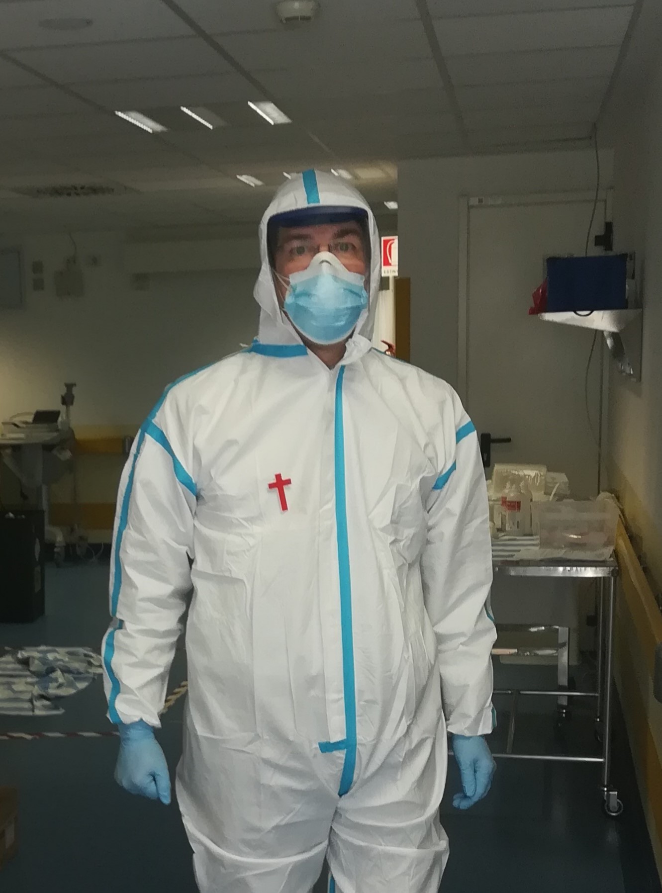 La mia presenza in ospedale, che vuole essere la presenza della Chiesa, penso sia servita come parola d’incoraggiamento, sostegno e preghiera: per il personale, costretto a portarsi dentro una carica emotiva molto grossa (uno mi ha confessato che alla fine del turno, tornando a casa si fa un pianto da solo in macchina per scaricarsi un po’ e per arrivare così in famiglia con una parvenza di “normalità”); una presenza per il malato “Covid”, senza dimenticare i malati “normali” costretti al ricovero in questi giorni e privati della visita dei familiari impossibilitati ad entrare nell’ospedale; una presenza servita anche ai familiari che hanno così saputo che il loro caro non era “solo” in questo momento ma attorniato dalla preghiera, dalla professionalità e dall’amore di molte buone persone.