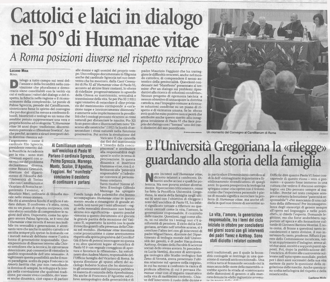 Avvenire – Cattolici e laici in dialogo nel 50°di Humanae vitae – 26/05/18