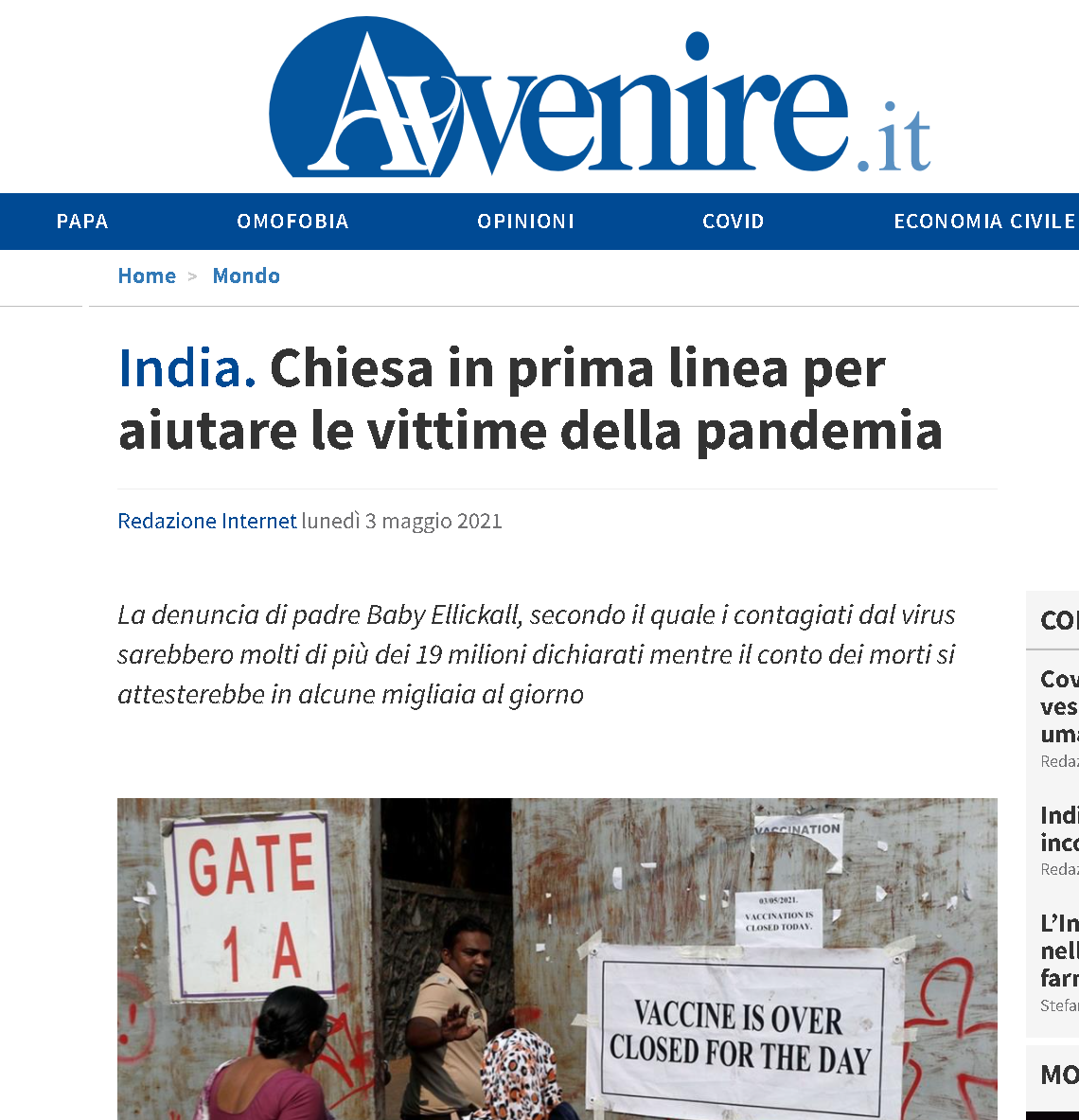 Avvenire – Chiesa in prima linea per aiutare le vittime della pandemia 3/05/2021