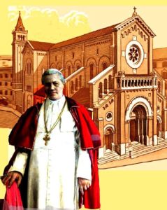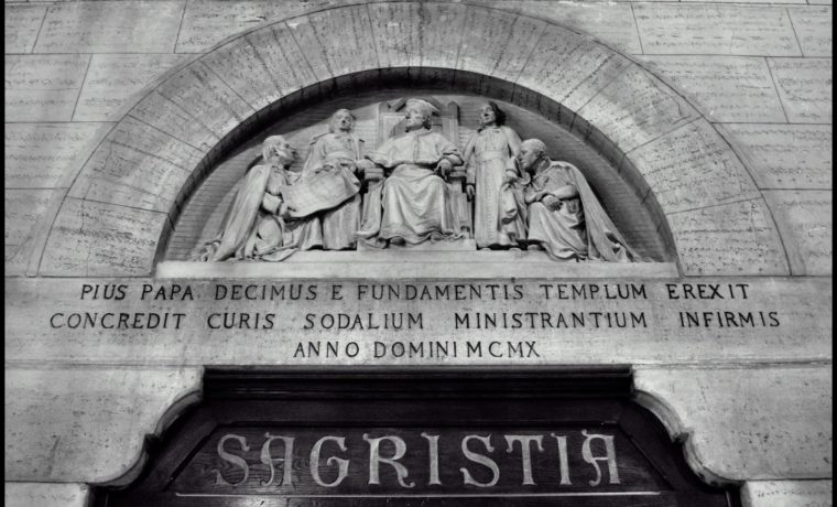 Sulla entrata alla “Sagrestia” è ricordata la «Benedizione della Prima pietra» nel Palazzo Apostolico di San Pio X, alla quale era presente Santa Giuseppina Vannini. Ne dà testimonianza scritta Suor Andreina Frare, – come s’è già scritto -, molto intima della Madre Generale. La determinazione di concentrare in questa Chiesa tutte le Solenni Celebrazioni collegate con la Canonizzazione di Maria Giuseppina Vannini, forzatamente dovuto alla inagibilità della Chiesa di S. Maria Maddalena, anche se in molte “Figlie di San Camillo” c’è un ben comprensibile smarrimento, noi le esortiamo a leggere anche in questa inattesa occasione un “segno di continuità” con quel Sacro Luogo in Piazza Fontana di Trevi, per anni sede del Beato Fondatore, – a qualche centinaia di metri dalla Comunità delle Suore di “Nostra Signora del Cenacolo” -, e che è stata la provvidenziale «occasione di Dio» per lo storico incontro delle due Sante Anime, del quale s’è scritto alquanto.