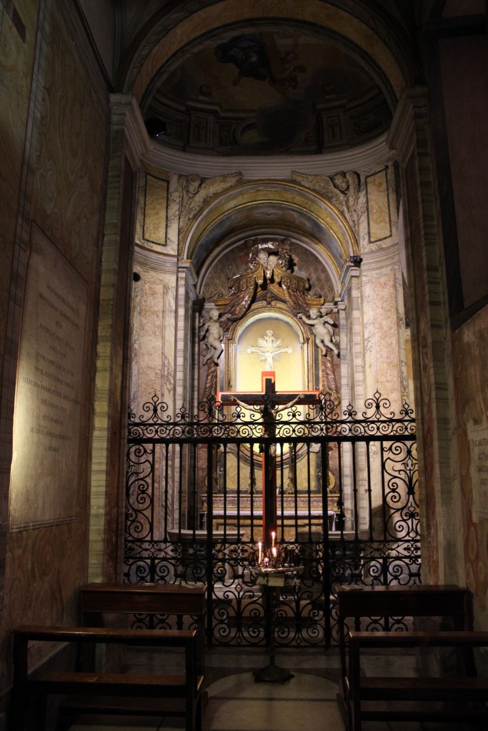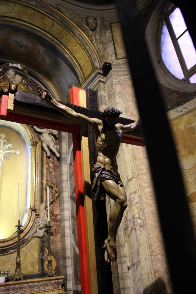 Sull’altare è conservato il Crocefisso realizzato da autore ignoto su un pezzo di legno intero in pino, che Camillo trovò nell’ospedale San Giacomo e che custodì gelosamente, portandolo con sé quando lasciò quell’ospedale. E’ il crocefisso che parlò a San Camillo. In uno dei momenti di grande sofferenza Camillo si mise in ginocchio davanti al crocefisso piangendo e pregando, implorando luce per decidere della sua vita. In quel momento sentì che il Crocefisso allargava le braccia dalla croce e lo abbracciava e confortava con la frase «Vai avanti, pusillanime! L’opera è mia non tua, non aver paura, coraggio». Questo coraggio accompagnò poi Camillo per tutta la sua vita.