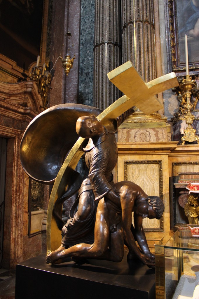 Conclusa la liturgia dell’altare, egli continuava l’adorazione al letto degli infermi. «Considerava egli tanto vivamente la persona di Cristo in loro che spesso, quando li imboccava, immaginandosi che quelli fossero i suoi Cristi, domandava loro sottovoce grazie e il perdono dei suoi peccati, stando così riverente alla loro presenza come stesse proprio alla presenza di Cristo, cibandoli molte volte scoperto e inginocchiato … Quando prendeva qualcuno di loro in braccio per cambiargli le lenzuola, lo faceva con tanto affetto e diligenza che pareva maneggiasse la stessa persona di Gesù Cristo. E anche se l’infermo fosse stato il più contagioso o lebbroso dell’ospedale, nondimeno lo pigliava in braccio viso a viso, accostandogli il suo volto alla testa come fosse stata la testa sacra del Signore … Molte volte nel licenziarsi baciava loro le mani, o la testa, o i piedi, o le piaghe come fossero state le piaghe di Gesù Cristo» (Vita manoscritta, 228s).