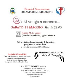 «11 maggio 2019 h. 22 SAVE THE DATE»: circola tra i ragazzi che popolano la notte della movida mondragonese un volantino young style con loghi che ricordano gli inviti alle serate musicali dei bar, nella villa comunale fino al molo e parte del lungomare. Circola da una settimana, quasi senza clamore, poiché sull’intestazione ci sono simboli che rimandano ad “altre entità”, qualcosa chiamato “forania”, “diocesi”, insomma “roba di chiesa”. Ma ci sono frasi che in un certo momento e in un certo luogo possono diventare lame affilate: il titolo lo suggerisce una canzone di Battiato “e ti vengo a cercare”, è l’idea dei parroci, del vicario foraneo don Nando Iannotta, dei giovani delle parrocchie che aiutati dalla presenza dei missionari camilliani impegnati a Mondragone in una missione inter-parrocchiale per gli infermi e gli ammalati, si sono recati una settimana prima per distribuire i volantini e poi con tanto di ostensorio e statua della Vergine Maria in una tenda-gazebo con la provocazione stimolante: “Gesù è qui, ti cerca, ti vuole parlare, Egli davvero ti ascolta!”.