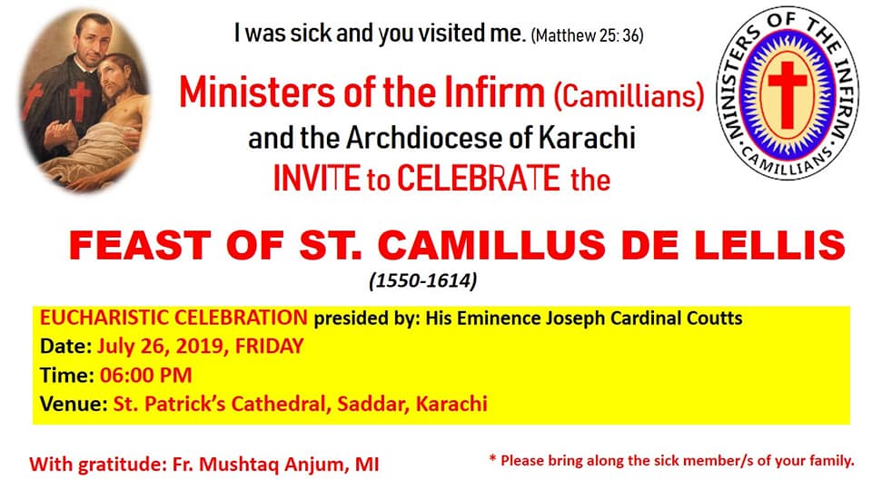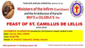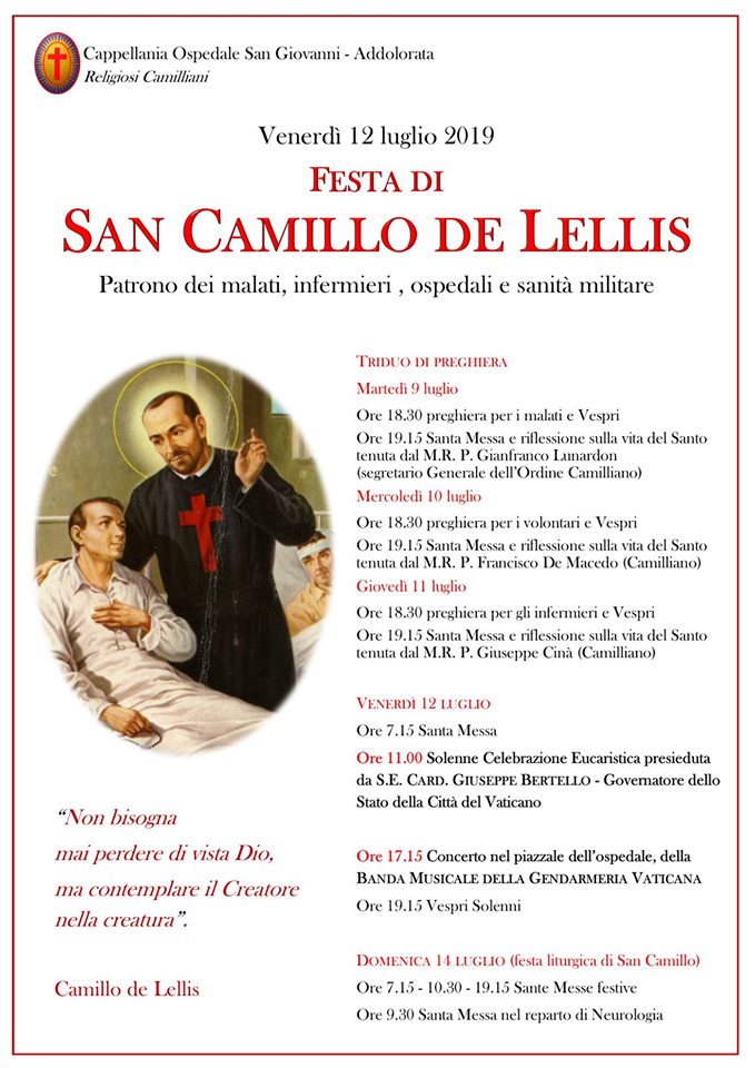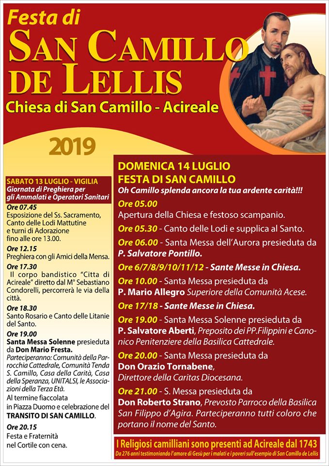 Il giorno della memoria liturgica di San Camillo è il 14 luglio, ma verrà anticipato a domenica 19 maggio, nella settimana che ricorda la nascita di S. Camillo (25 maggio 1550 a Bucchianico/Chieti).
