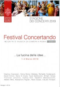 Al via la quinta edizione del Festival Concertando 2019, stagione dei concerti del Pontificio Istituto di Musica Sacra di Roma, che vede la presenza di un evento unico nel panorama musicale romano, un festival di musica da camera con concerti e masterclass per un periodo di lavoro intenso e concentrato nel tempo, a partire dall’1 marzo per una settimana, per far sì che musicisti provenienti da tutta Europa s’incontrino e si uniscano in un serrato confronto cameristico che porta alla produzione di cinque eventi di altissimo interesse.