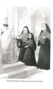 «A 13 anni, – 19 marzo 1873 -, riceve i sacramenti della Cresima e Prima Comunione. Da questo momento percepisce distinta la chiamata allo stato religioso. Nessuno, in seguito, riuscirà a distaccare la pia giovane da quell’ideale, neppure il fratello Augusto che, in momenti critici della loro comune esperienza, cercherà con gli argomenti del cuore d’immettere nella propria sfera familiare la sorella per sottrarla alla solitudine e alla ventura.» (Informatio super Virtutibus, p.6)