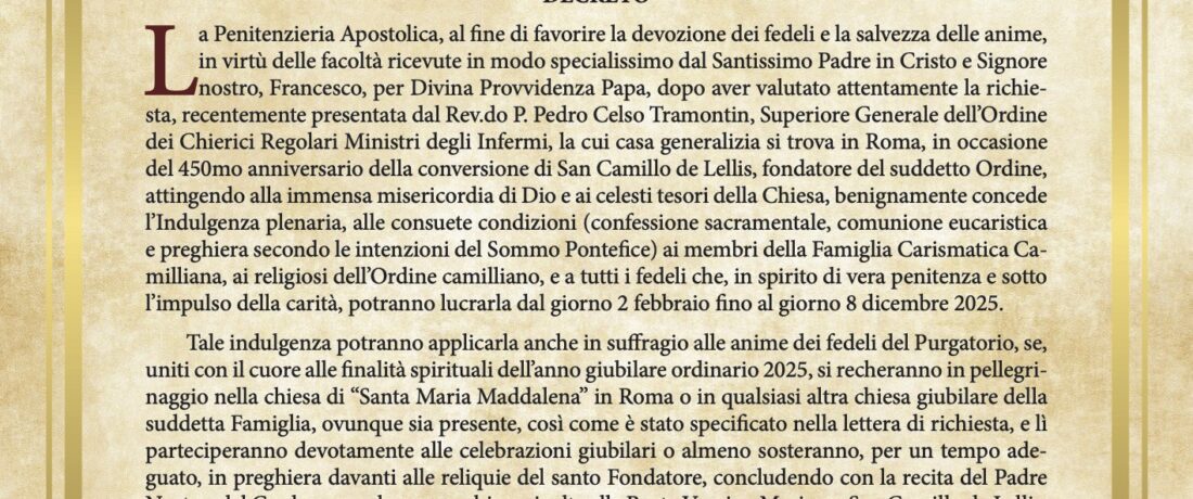 In occasione del 450° anniversario della conversione di San Camillo de Lellis, la Penitenzieria Apostolica ha concesso un’Indulgenza Plenaria speciale, … Leggi tutto Indulgenza Plenaria per il Giubileo Camilliano: Un Dono di Misericordia e Grazia per la Famiglia Camilliana