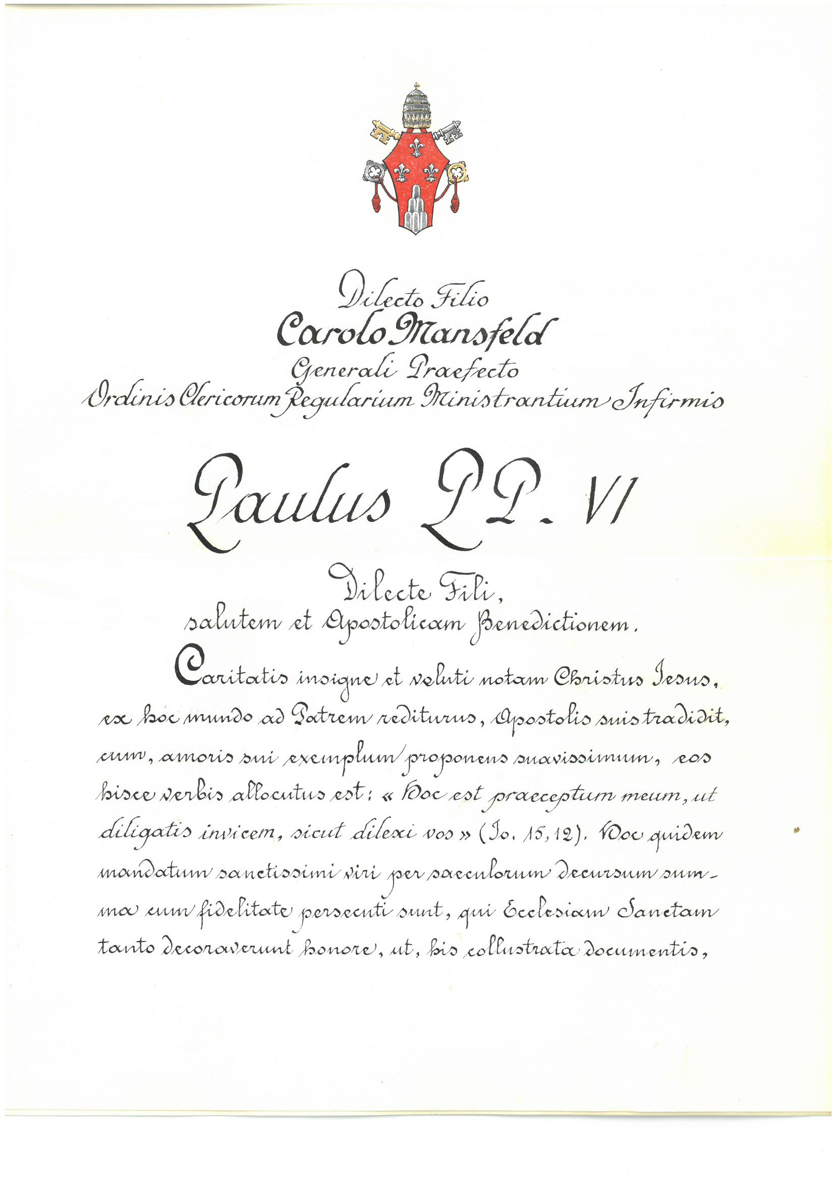 Di tale merito speciale e singolare nota di carità rifulge San Camillo de Lellis, del quale tu, diletto Figlio, assieme ai tuoi Religiosi, custodi generosi della intatta sua eredità, celebrate la prossima
