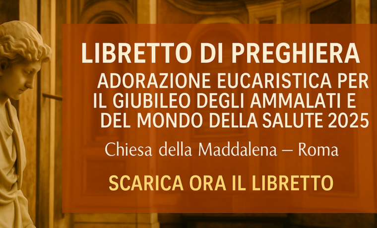 In occasione del Giubileo degli Ammalati e del Mondo della Salute, che si terrà sabato 5 aprile 2025 presso la Chiesa di Santa Maria Maddalena in Campo Marzio (Roma), mettiamo a disposizione il libretto completo per l’adorazione eucaristica.