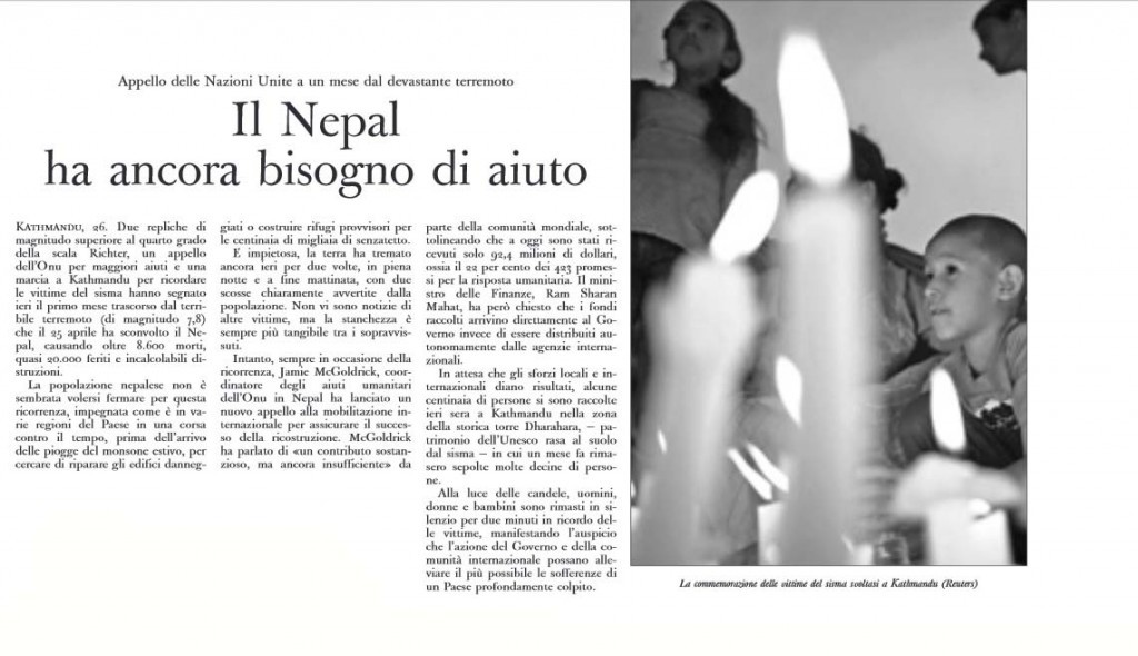 L’Osservatore Romano – Appello delle Nazioni Unite a un mese dal devastante terremoto – 27/05/15