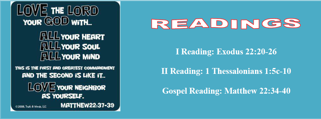 In the 1st Reading from Exodus 22:20-26 God is making clear how seriously He takes the way we treat our neighbours. We see that love of neighbour includes loving foreigners (or migrants), widows, orphans, and poor. The Lord calls us to love them in action. We should welcome them, treat them with respect, and provide for their needs. The foundation for the love of neighbour is nothing but our experiences of being as foreigners (being strangers), widows (being utterly helpless), orphans (being abandoned) and poor (being in want).