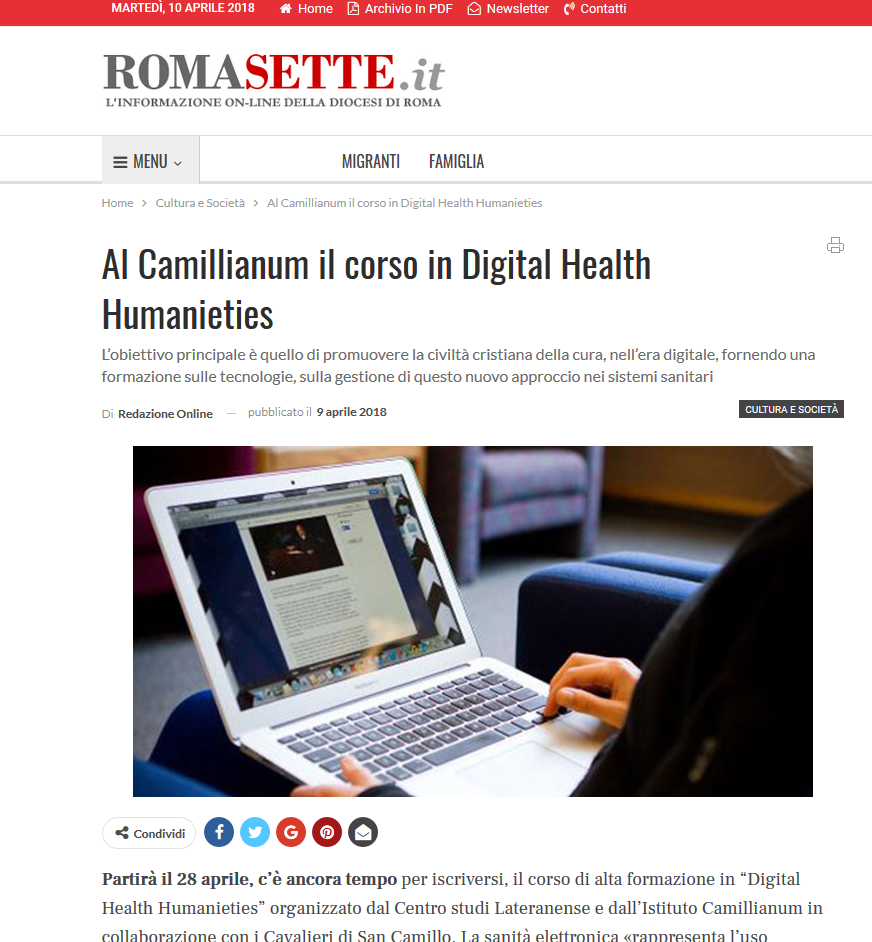 Partirà il 28 aprile, c’è ancora tempo per iscriversi, il corso di alta formazione in “Digital Health Humanieties” organizzato dal Centro studi Lateranense e dall’Istituto Camillianum in collaborazione con i Cavalieri di San Camillo. La sanità elettronica «rappresenta l’uso combinato delle tecnologie dell’informazione e della comunicazione, in particolare Internet, applicato al settore sanitario, sia in presenza che a distanza (in questo caso si parla di telemedicina). Lo stare in rete – scrivono gli organizzatori – sta cambiando il modo di essere pazienti, di essere medici, di pensarsi come settore sanitario».