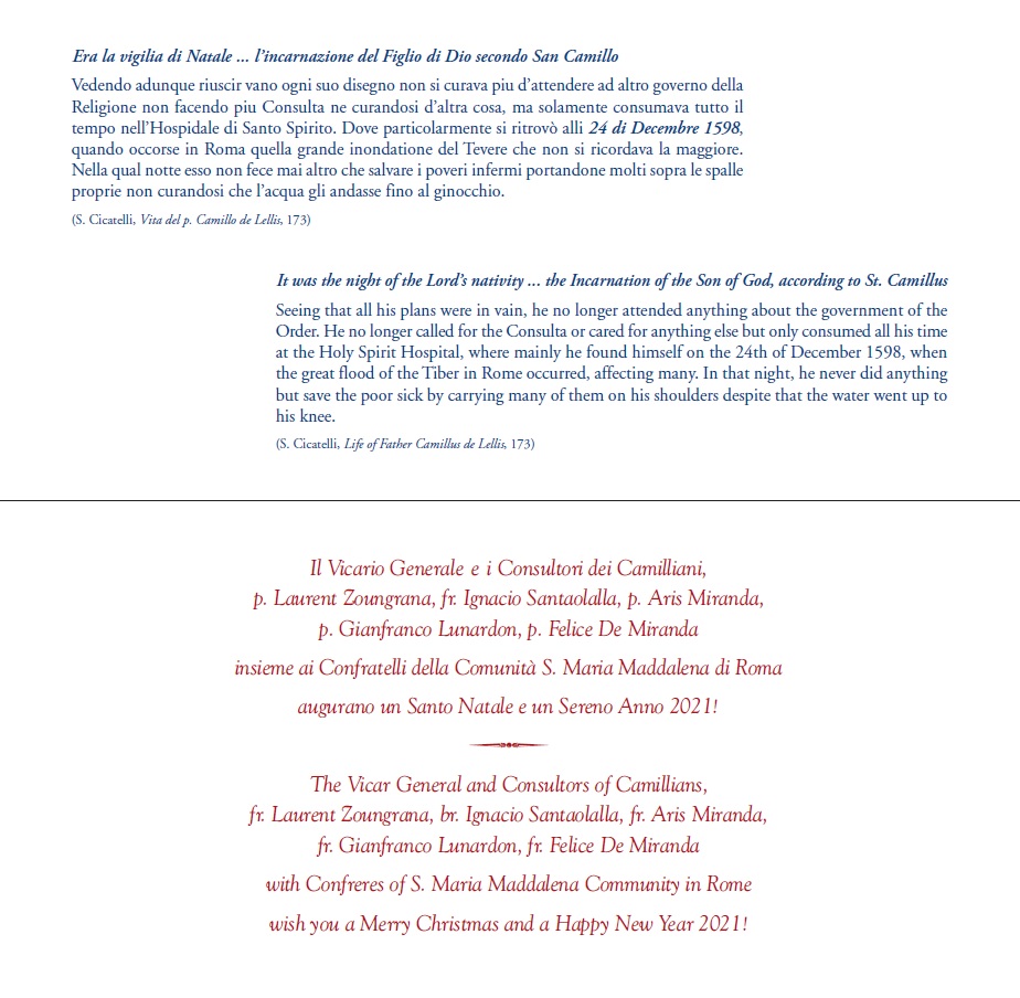 Il mondo è afflitto da un’altra pandemia chiamata coronavirus (COVID-19), che ha causato a livello planetario la morte di circa 1,4 milioni di persone (al 1-XII-2020). Dal periodo delle pestilenze nel tardo Medioevo, all’HIV/AIDS, passando per l’infezione di Ebola in Africa occidentale e al COVID-19, nella stretta attualità, gli uomini che portano la croce rossa sul petto stanno realizzando una ‘crociata’ mondiale per celebrare queste ‘feste della carità’. Da questi tragici eventi è nata la nuova scuola di carità di San Camillo de Lellis, che ha generato ed inviato i ‘martiri della carità’, animati dal carisma camilliano e dalla spiritualità del servizio.