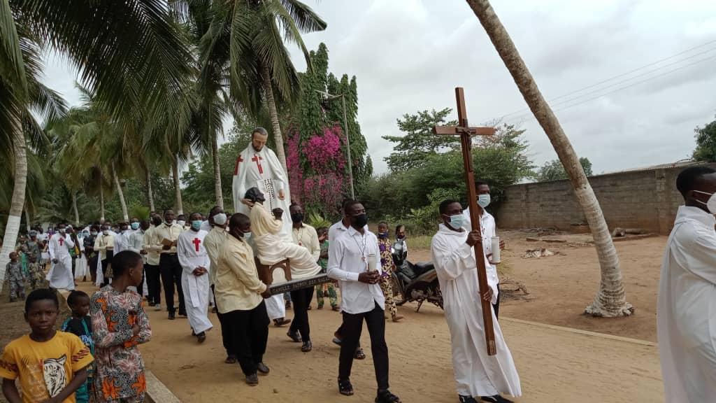 Domenica 06 marzo grande festa nella Casa di formazione di Segbanou per l’installazione e la benedizione della statua di San Camillo nel nostro presidio ospedaliero antistante. In effetti dopo la S. Messa delle 9.00 GMT i giovani in formazione e tutti fedeli con la statua portata in processione si sono diretti dalla chiesa verso il presidio. Tra acclamazioni e canti di gioia la statua è stata fissata al posto previsto nel cortile del presidio alla grande soddisfazione del personale, dei malati e loro familiari presenti.