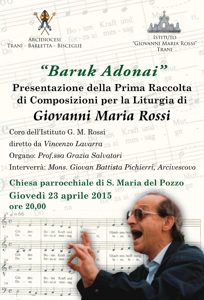 L’Istituto “Giovanni Maria Rossi”, fin dalla sua costituzione, si è posto l’obiettivo di far meglio conoscere il religioso camilliano padre Giovanni Maria Rossi, musicista eclettico che ha dedicato la vita al servizio della Chiesa e della musica per la liturgia. Giovedì 23 aprile, ore 20.00, a Trani presso la chiesa parrocchiale di S. Maria del Pozzo sarà presentata la prima raccolta di composizioni per la liturgia pubblicata dall’Istituto stesso. Per la Chiesa locale di Trani egli compose un’opera tra le più significative del post concilio – la Messa “Il Risorto crocifisso” dedicata a San Nicola Pellegrino – che rimane paradigmatica.