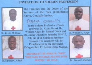Sabato18 aprile, presso il Seminario San Camillo di Nairobi (Kenya), i Confratelli Justus Onsare, Oleck Samuel, William Augo e Kitizo Omari, emetteranno la loro professione solenne di voti religiosi.
