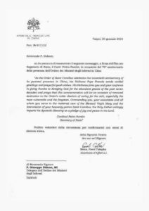 cfr. lettera di augurio e di apprezzamento a firma di S. Em.za Card. Piero Parolin, segretario di stato vaticano.