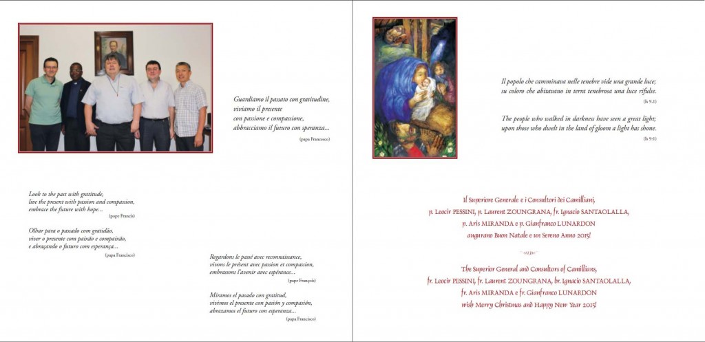 Si concorda un incontro di Consulta per la programmazione (attuazione del Progetto Camilliano) per i giorni 22 e 23 gennaio 2015, presso la Casa Generalizia delle suore Ministre degli Infermi di San Camillo (Roma). Tale incontro si concluderà il giorno sabato 24 gennaio 2015, con una riunione tra p. Leocir Pessini, madre Zelia Andrighetti e madre Lauretta Gianesin – rispettivamente neo-eletti superiore/a generale dei Camilliani, delle Figlie di San Camillo e delle Ministre degli Infermi di San Camillo – e i loro Consigli generali: la celebrazione eucaristica, uno scambio di opinioni su possibili progetti di cooperazione e il pranzo sono l’oggetto di questo primo incontro tra religiosi e religiose accomunati dallo stesso fuoco misterico!