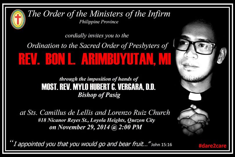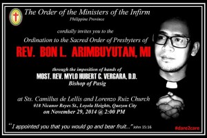 Sabato 29 novembre 2014, il confratello camilliano Bon L. ARIMBUYUTAN, della provincia delle Filippine è stato ordinato sacerdote, nella Chiesa dedicata a “San Camillo e a san Lorenzo Ruiz” a Quezon City. Ha presieduto la celebrazione l’Arcivescovo di Pasig, mons. Mylo Hubert C. Vergarad.