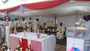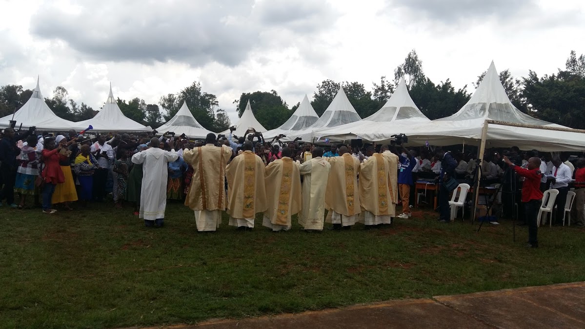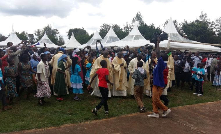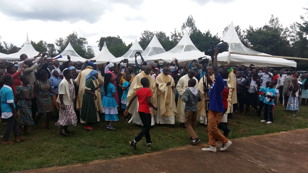 La cerimonia è iniziata alle 10.00 in punto, ma il Cardinale, che ha guidato personalmente la sua auto, vi erà già giunto un’ora prima. La funzione liturgica è proseguita fino alle 14.45, quasi cinque ore! La nostra paura era che la pioggia e il vento – che caratterizzano la stagione delle grandi piogge – avrebbero potuto trasformare il campo sportivo in una palude o quanto meno scalzare i picchetti delle tende, lasciando il pastore – Cardinal Njue – e tutte le sue pecore sotto l’acqua. Ebbene, la pioggia è arrivata, ma 15 minuti dopo che la funzione era terminata!