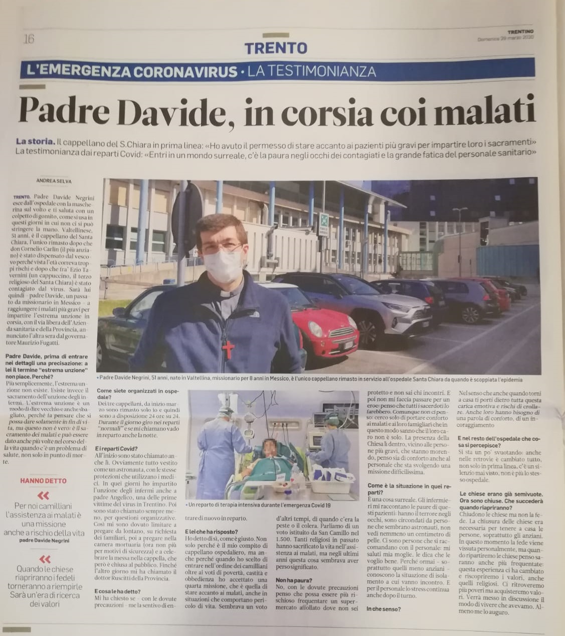 TRENTO. Padre Davide Negrini esce dall’ospedale con la mascherina sul volto e ti saluta con un colpetto di gomito, come si usa in questi giorni in cui non ci si può stringere la mano. Valtellinese, 51 anni, è il cappellano del Santa Chiara, l’unico rimasto dopo che don Cornelio Carlin (il più anziano) è stato dispensato dal vescovo perché vista l’età correva troppi rischi e dopo che fra’ Ezio Tavernini (un cappuccino, il terzo religioso del Santa Chiara) è stato contagiato dal virus. Sarà lui quindi – padre Davide, un passato da missionario in Messico – a raggiungere i malati più gravi per impartire l’estrema unzione in corsia, con il via libera dell’Azienda sanitaria e della Provincia, annunciato l’altra sera dal governatore Maurizio Fugatti.