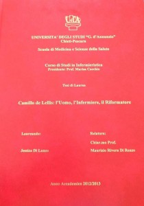 La scelta è ricaduta proprio su San Camillo grazie al forte desiderio di approfondirne la conoscenza e soprattutto per metterne in risalto sia l’aspetto umano che la visione assistenziale. L’idea di sviluppare la mia tesi di laurea su San Camillo è sempre stata presente fin dal primo anno di Università, quando il Professor Maurizio Rivera Di Renzo, che poi è diventato il mio Relatore, ci fece lezione sulla storia dell’assistenza infermieristica. Tra le tante figure che hanno contribuito allo sviluppo dell’assistenza ci illustrò anche l’opera effettuata da Camillo de Lellis e in quel momento nacque in me l’idea che poi ho