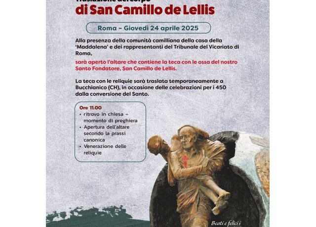 La traslazione avverrà giovedì 24 aprile 2025, con un momento solenne presso la Chiesa di Santa Maria Maddalena a Roma, dove abitualmente riposano le spoglie del Santo. In presenza della comunità camilliana e dei rappresentanti del Vicariato di Roma, sarà aperto l’altare che custodisce la teca reliquiaria, secondo la prassi canonica. A seguire, un tempo di venerazione e preghiera segnerà l’inizio del pellegrinaggio.