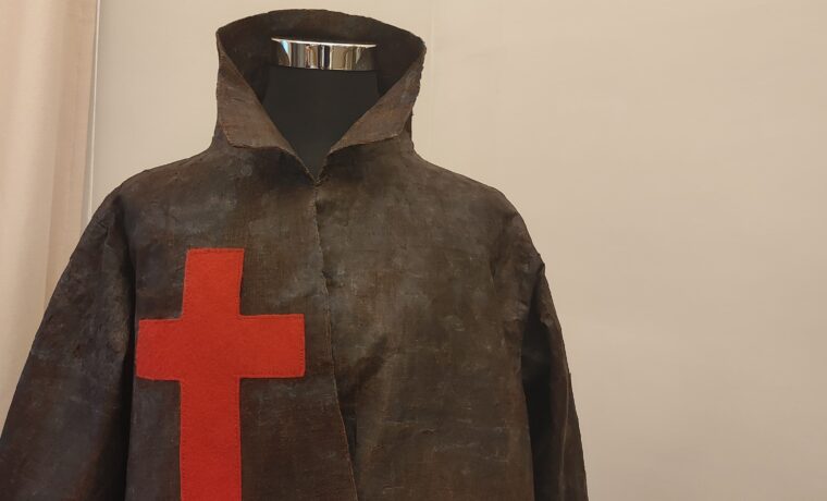 Il restauro è stato preceduto da uno studio accurato della loro confezione per verificare che non sia stata manomessa o riadattata nel periodo successivo. In questo caso non sono visibili interventi postumi, dopo un’accurata rimozione della polvere tramite microaspiratore, si è proceduto per cercare di restituire la forma originale, inumidendo il tessuto con vaporizzazione di acqua distillata e successiva stiratura e messa in piano del tessuto. Il consolidamento delle zone degradate è stato effettuato risarcendo tutte le lacune, inserendo inserti di tessuto simile all’originale, i frammenti distaccati sono stati reinseriti con l’ausilio di un supporto di tela nella parte interna fissata con colla termica per tessuti, tutti i bordi delle lacune e degli inserti e le parti cucite sono state fissate con intervento di cucitura e rammendo ad ago e filo. Al termine è stata reinserita la croce latina in tessuto rosso simile all’originale. Infine si è eseguita una “messa in forma” generale con accurata stiratura e composizione della veste in modo da poter essere esposta su un manichino.