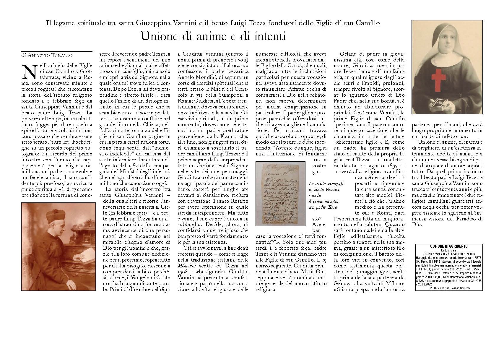 Unione di anime e di intenti, il bellissimo articolo pubblicato sull’Osservatore Romano dello scorso 24 febbraio 2023, sul profondo legame tra Santa Giuseppina Vannini e il beato Luigi Tezza, fondatori delle religiose figlie di San Camillo.